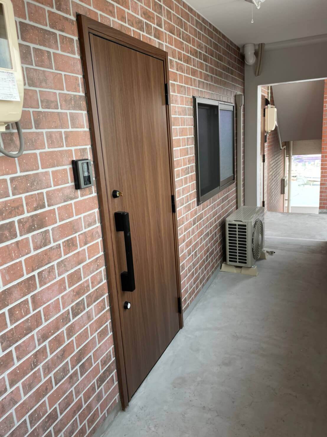 レンガ調の壁面に、木目調の扉が素敵です。